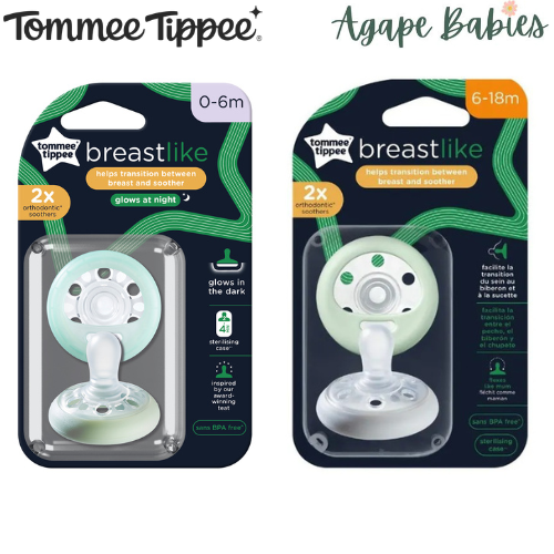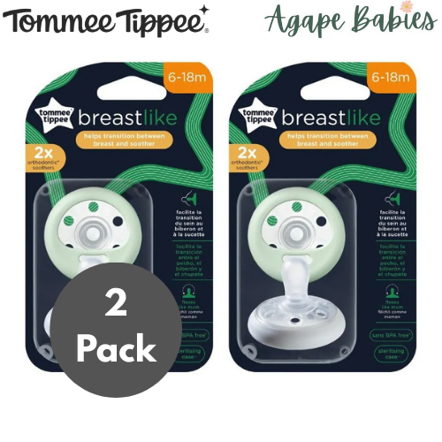 - Tommee Tippee Breast-Like Soothers, 0-6M, 6-18M, 2-pack, assorted colors.
