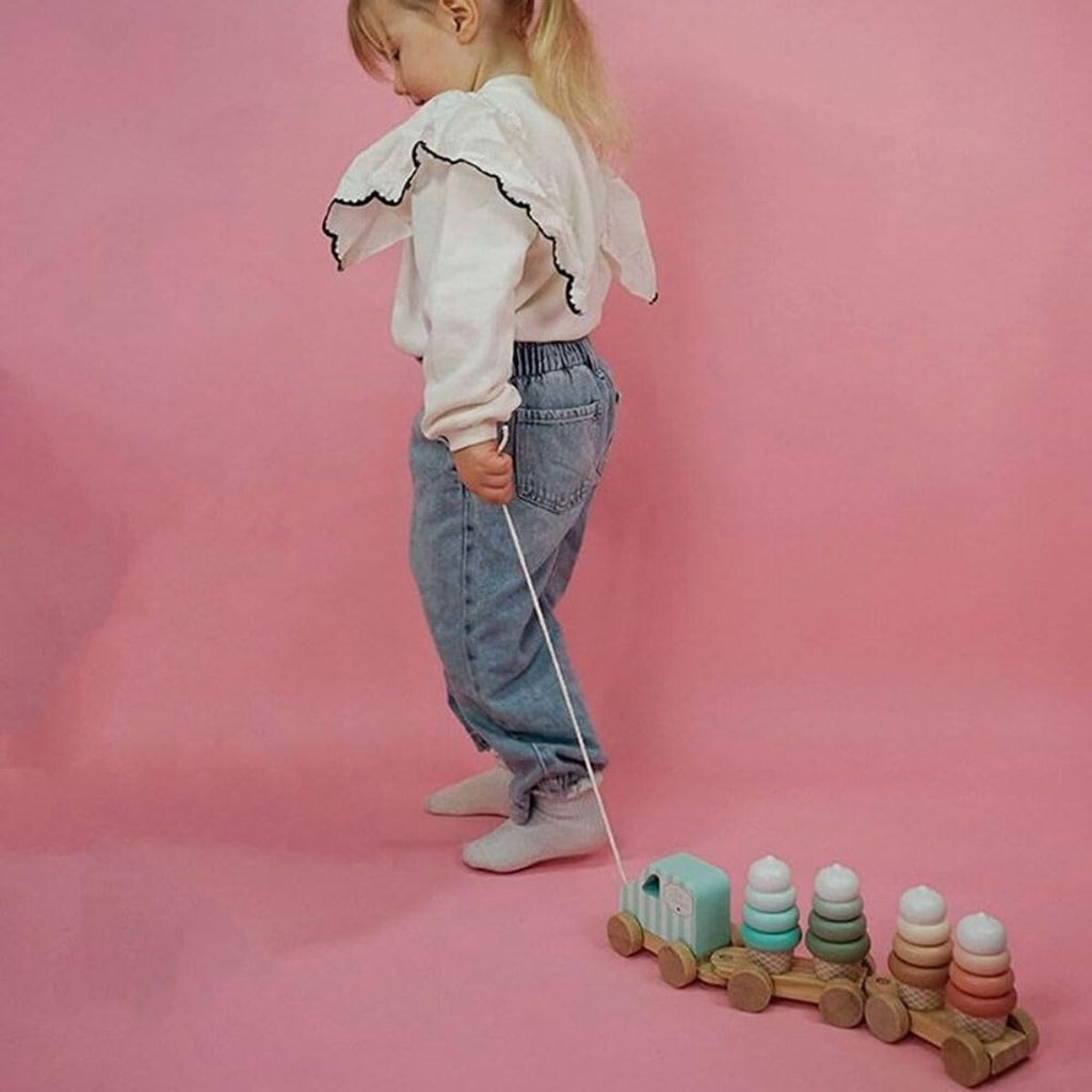 • 4x stackable ice cream cones in pastel colors, 1x pull-along trailer with string.