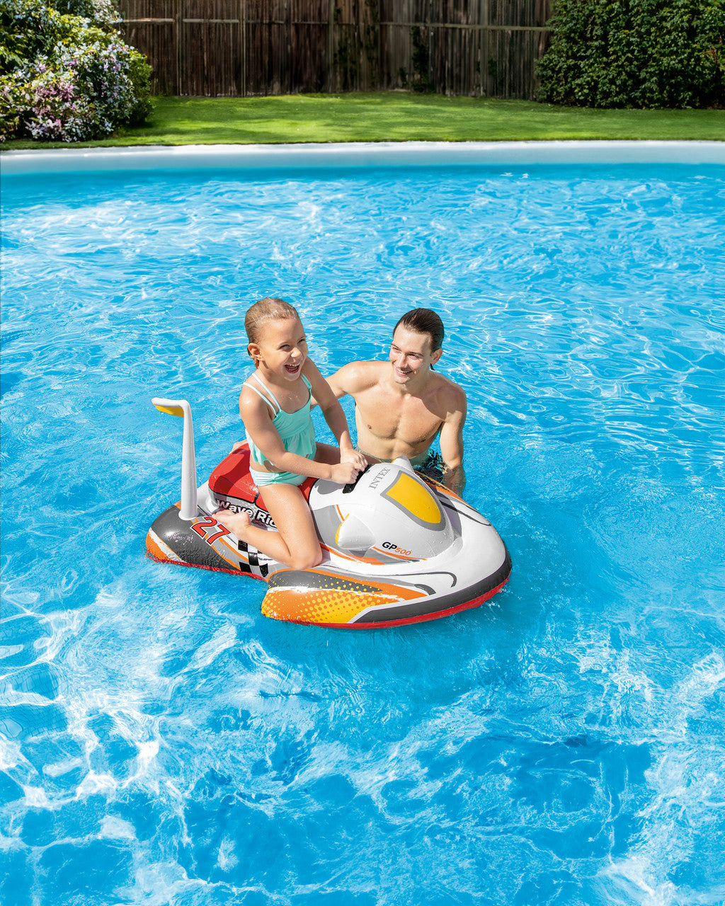 Your kids can pretend to ride on a jet ski with the Intex Wave Rider Ride-on pool float. Bold colors and a sleek design make this float a hit! The wide base helps stabilize the float for a sturdy and enjoyable ride. Made with a heavy-duty grab handle for kids to hold on, this float is perfect for having an adventure in the pool.