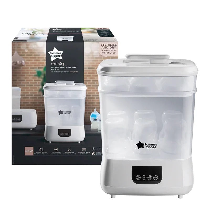 The less time you spend cleaning and preparing bottles the better. Sterilise and dry up to 6 baby bottles in 40 minutes with the Tommee Tippee advanced electric steam steriliser and dryer. You can choose from 3 different functions - sterilise only, dry only or save time and sterilise and dry in one automatic cycle. The drying function means theres no need for you to handle wet bottles and baby accessories after sterilising.