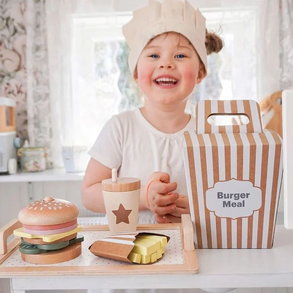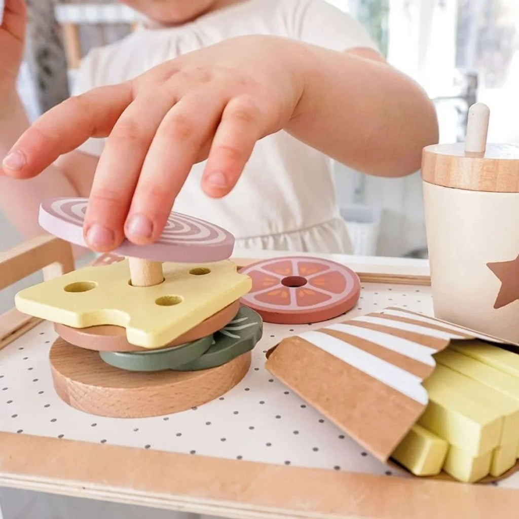 A complete burger meal for the hungry. With our imaginative burger meal, the child can put together the perfect menu themselves using the included menu cards. The burger is stackable and the child chooses which accessories should be included in each menu. Four menu cards suggest different combinations of burgers, fries, and the accompanying drink. Only your imagination sets the limits. Encourages creative play.