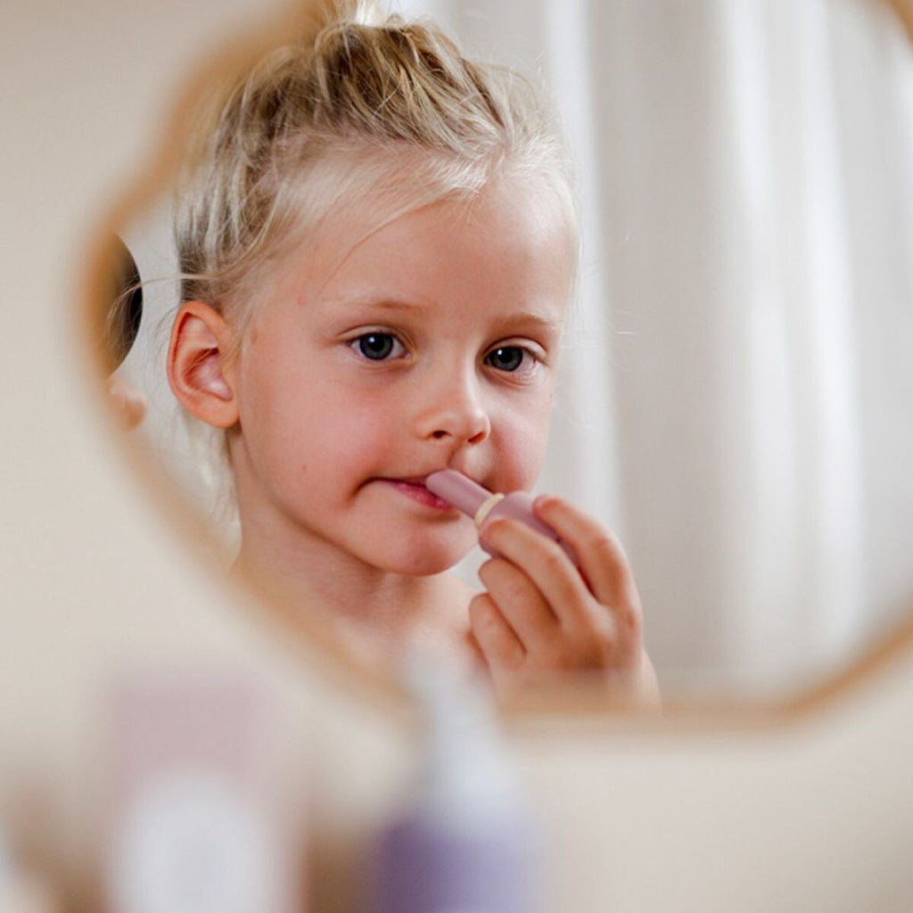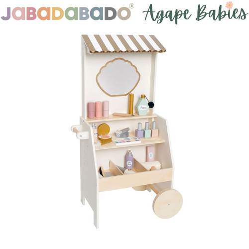 Welcome to a truly luxurious beauty salon! Jabadabado's wooden beauty salon is filled with everything you need to open your own salon at home. Allow the customers to sit comfortably in a chair and enjoy the treatment. Help the customers with their makeup before the party. Start by adding the cucumber slices on their eyes and apply a layer of face cream before you start with the makeup. Apply a layer of foundation and blush. What colour do you want for lipstick and eye shadow? You get the finishing touch by applying mascara and kajal around the customer's eyes. When the makeup is done, it's time to take care of the hair. Style their hair in the most imaginative ways using a hairdryer, flat iron or curling iron before finishing with a little fixing hairspray. Of course, the visit ends with an exclusive perfume. When you have finished the treatment, the customer can have a look in the mirror to see the beautiful result. All accessories are made of wood for smudge-free playing. The beauty salon has wheels and handles so it can be easily moved and on the two shelves all make-up and hair products can be stored. A total of 26 different luxurious accessories are included. Guaranteed to keep the child occupied for hours. Encourages creative role play and only the imagination sets the limits when the play begins.C