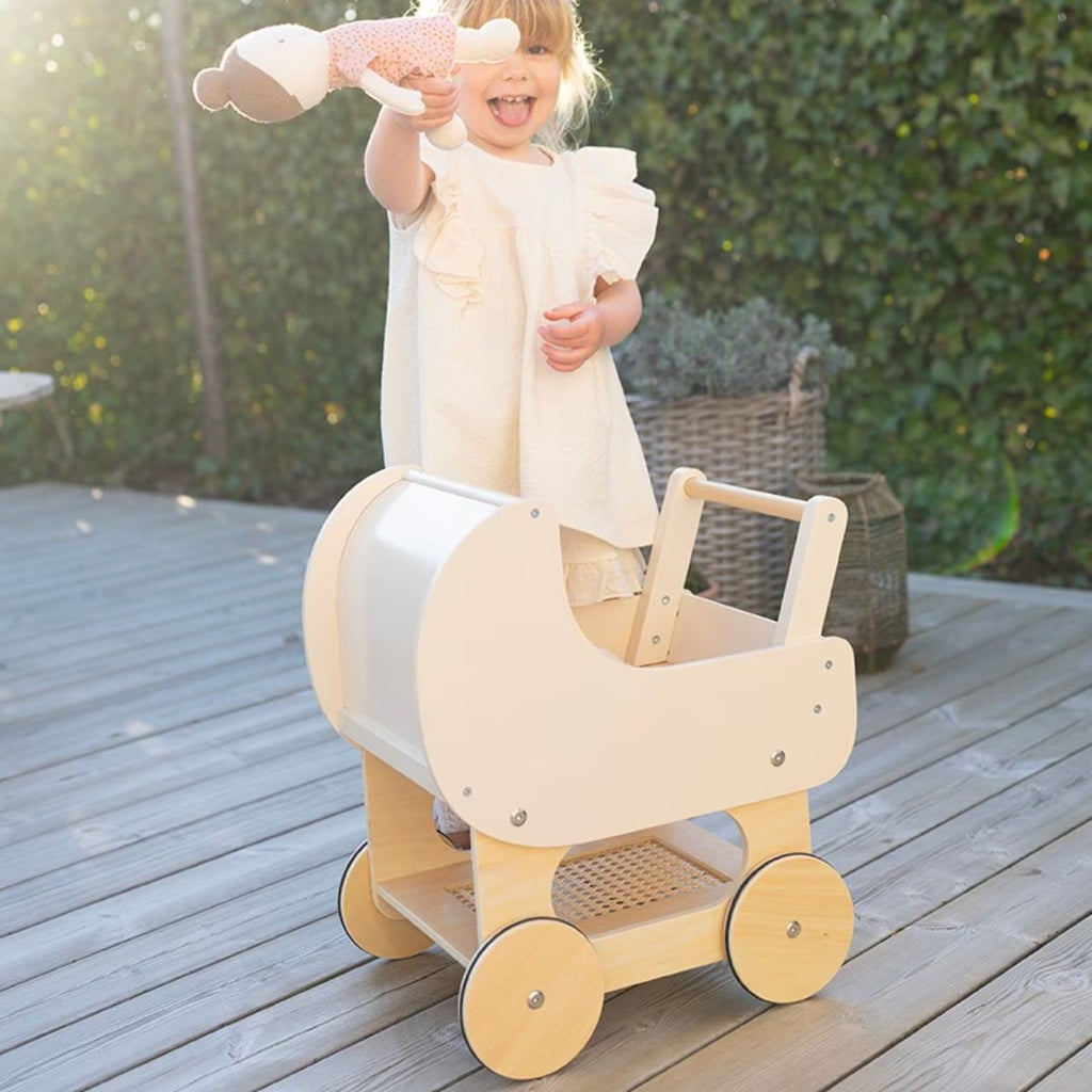 Time to take a walk! Jabadabado's cute wooden doll wagon has a lovely cream colour and decorative rattan-like details. It is a classic toy that fits perfectly into the children's room. Let your dolls and Teddy bears sleep in the wagon and take them for a walk. Under the wagon there is a shelf where you can store accessories for the doll, or keep other favorite toys. Jabadabado's doll Astrid loves the wagon and wants to accompany you when you go out and have coffee with your friends. The wheels have a rubber strip, so they roll safely on all surfaces without leaving marks. The doll wagon will be an appreciated gift that can be played with for a long time to come.