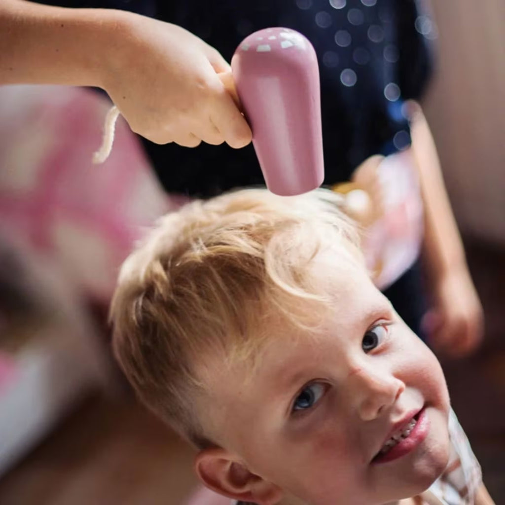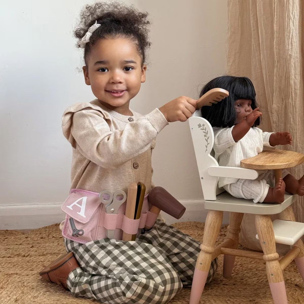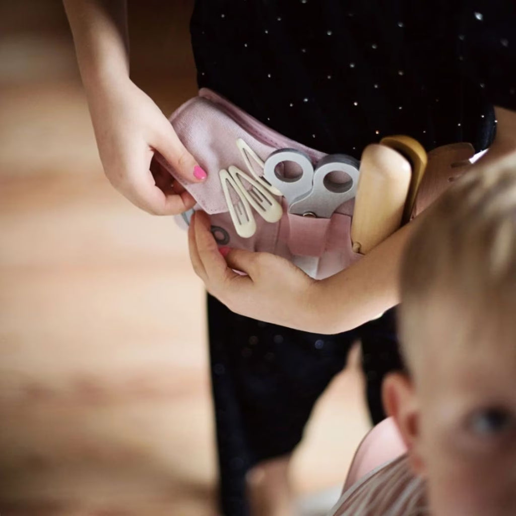 Your little stylist can finally open their own hair salon at home! With this delightful hairdressing set from Jabadabado they will have everything they need to cut and style various fun hairstyles. Harmlessly snip away with wooden scissors, style with the straighteners, then blow dry and apply hairspray to complete the look. When they're finished with each customer, each instrument neatly slides into the charming pink belt which they can strap around their waist, keeping everything nice and tidy.