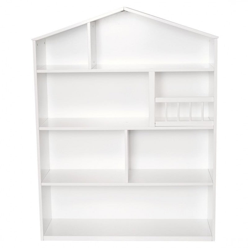 White stylish bookcase that will look beautiful in the children's room. The bookcase is designed to look like a large doll's house. There is plenty of room for practical storage of story books and favourite toys. The bookcase is both convenient for storage and a stylish item for the children's room. It can also be a fun doll's house. A bookshelf where your child can reach all of the shelves and can choose a good night story for themselves. The bookshelf has 4 levels and 6 different compartments. To be placed on the floor and screwed into the wall.