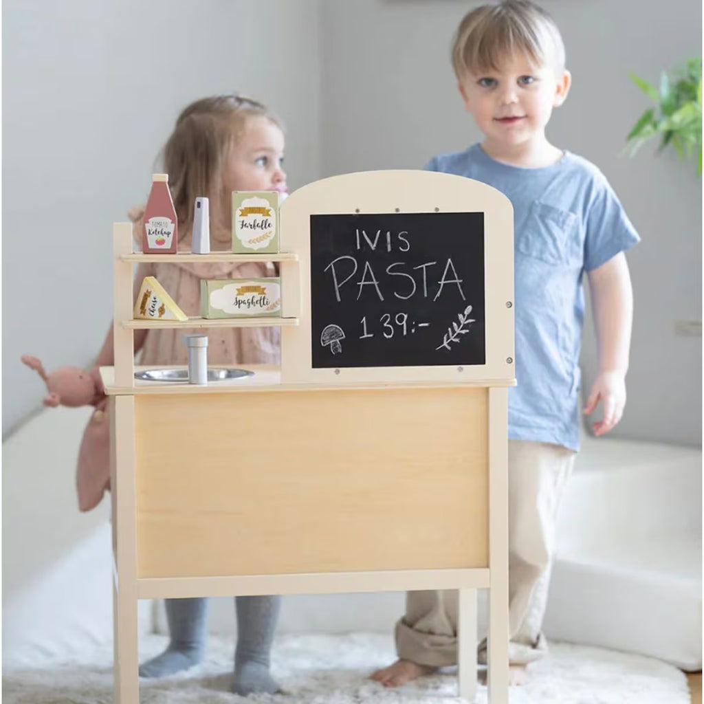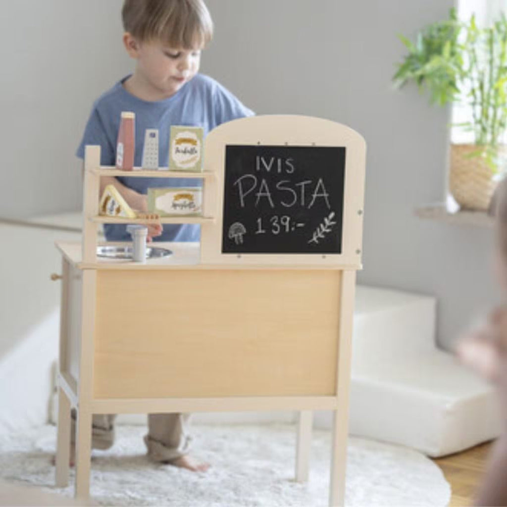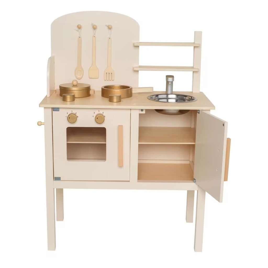 A wonderful children's kitchen for all food-loving children. With this lovely toy kitchen in cream, you will quickly become a real master chef. The kitchen contains lots of fun details, such as a sink, hob, oven, as well as a pot, frying pan and three kitchen utensils. Let your imagination run wild and create amazing dishes for the whole family. There is a chalkboard on the back of the stove so you can write what's for dinner. The kitchen is equipped with a hob, oven, sink, storage cabinets and two storage shelves with plenty of space for all kitchen accessories. The doors can be opened and on the hob there are 2 hotplates with associated screwable buttons so you can regulate the heat. When you're done in the kitchen, you can wash the dishes in the sink. There are hooks on the wall to hang your kitchen utensils and two nice pots are included. Bon appétit!