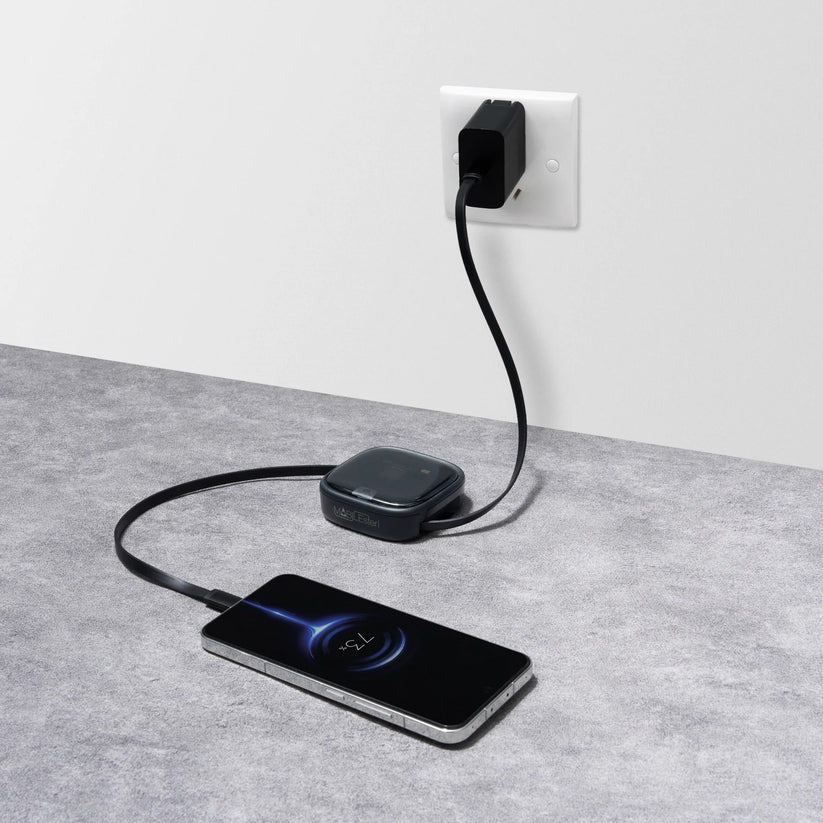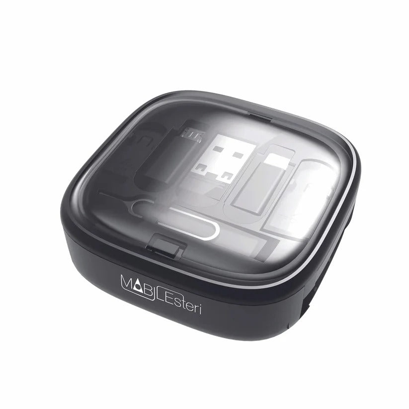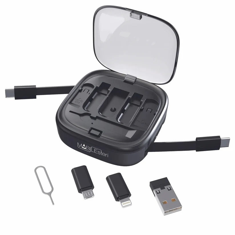 This ultra-compact 8-in-1 Multi-Tool Travel Essentials Kit has everything you need for your travels, from changing SIM cards to charging your phone or syncing data. It ensures that your tablet, smartphone, and USB-C laptop stay powered while you're on the go. It features a retractable USB-C-to-USB-C charging and sync cable with interchangeable connectors, including . Additionally, built-in nano-SIM slots help you stay organized and prevent the loss of SIM cards or SIM card removal pins.